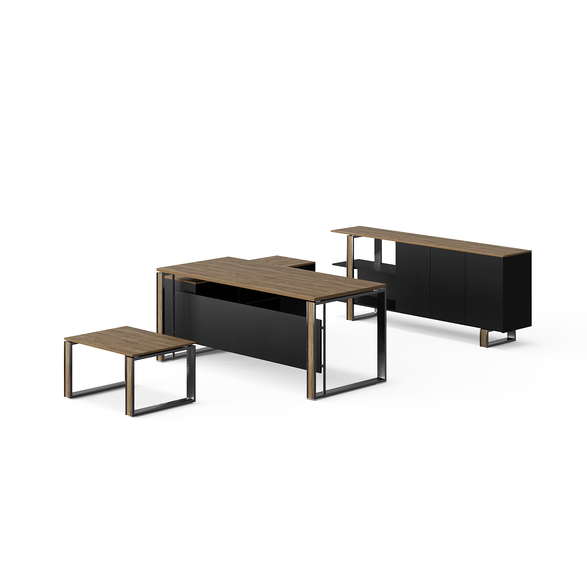 L-shaped office desk with cabinet and tea table